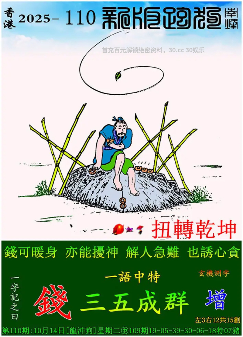110期一字記之曰:【錢】錢可暖身,亦能擾神,解人急難,也誘心貪《增》